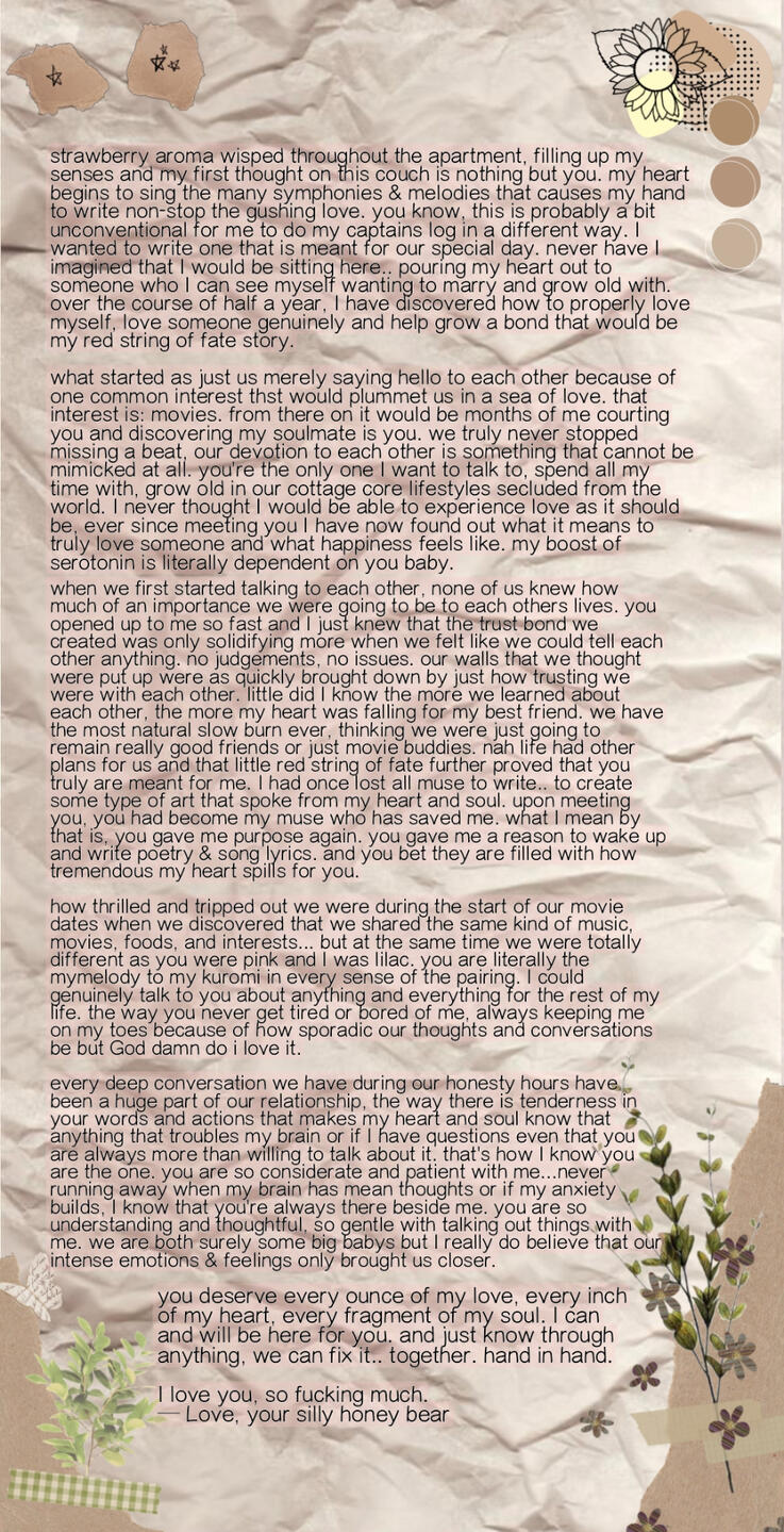 you came to me immediately when we added each other on discord and you offered to create a server for us and I had no idea what to expect. little did I know it was a place of sanctuary and love. what we literally call our universe now.